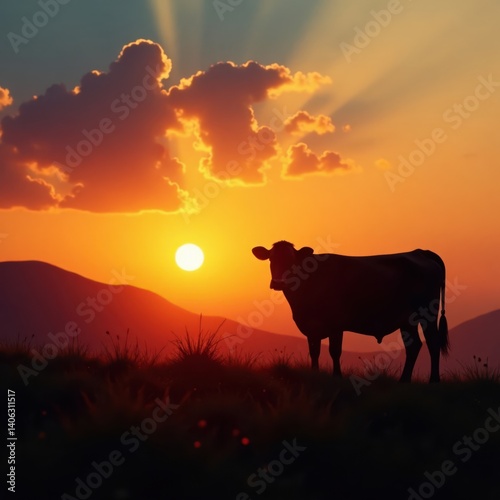 Cattle silhouette against sunset, farm animals, rural