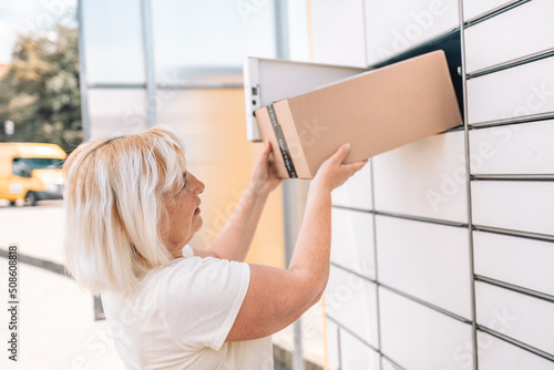 Caucasian 50s 60s woman picks up mail from automated self-service post terminal machine. Mail shipping concept