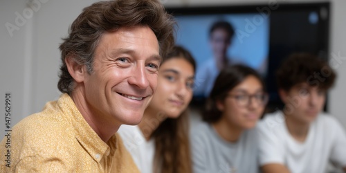 Caucasian adult male leading team meeting with young diverse group in office setting