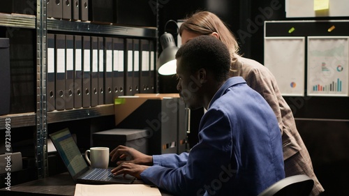Caucasian and african american law enforcement personnel and investigators meticulously analyze evidence and exchange information in office. Black policeman and his female police partner review cases.