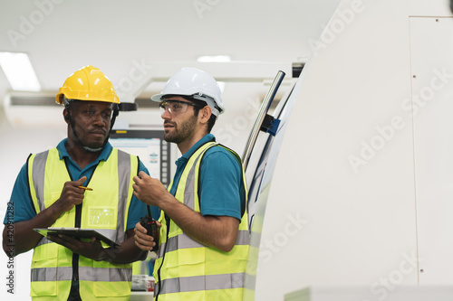 Caucasian and African production workers discuss together at CNC machine in factory. Concept of industry work, diversity group of people with copy space