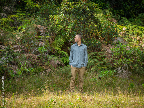 Caucasian Blond Man is Standing in the Middle of the Nature