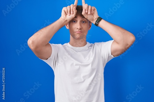 Caucasian blond man standing over blue background doing funny gesture with finger over head as bull horns