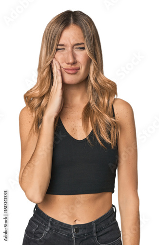 Caucasian blonde woman in studio having a strong teeth pain, molar ache.