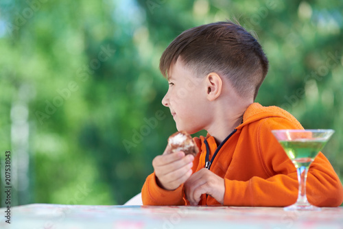Caucasian boy drinking green lemonade and eating cake on the nature. Copy space.