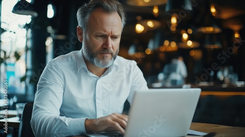 Caucasian businessman typing laptop, concentrating, focused, dressed professionally, indoors, at a restaurant table.