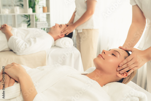 Caucasian couple enjoying relaxing anti-stress head massage and pampering facial beauty skin recreation leisure in dayspa modern light ambient at luxury resort or hotel spa salon. Quiescent