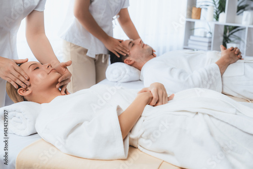 Caucasian couple enjoying relaxing anti-stress head massage and pampering facial beauty skin recreation leisure in dayspa modern light ambient at luxury resort or hotel spa salon. Quiescent