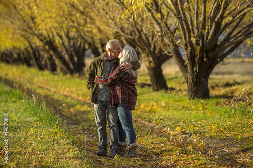 Caucasian couple kissing near trees in autumn