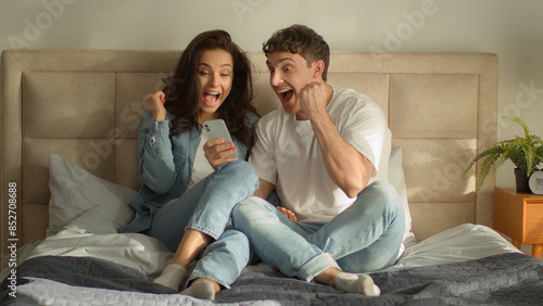 Caucasian couple sitting on bed bedroom looking at screen smartphone mobile phone man woman enjoyment cellphone homeowner good news victory success achievement emotions celebrating surprise excitement