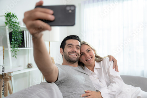 Caucasian couple video calling talking with friends on mobile phone in living room.