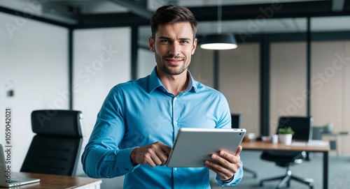 Caucasian entrepreneur holding tablet determined expression business casual clothing modern office background late twenties male