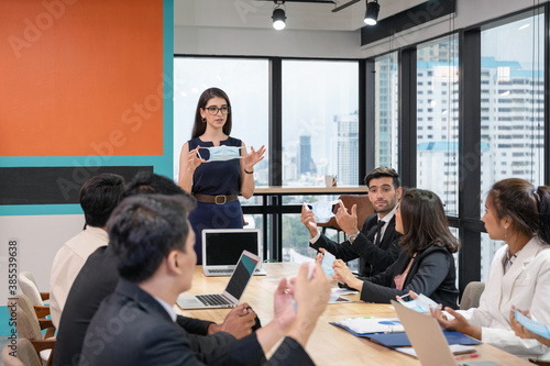Caucasian executive woman holding face mask with proposes a new company policy in the office during multiethnic meeting