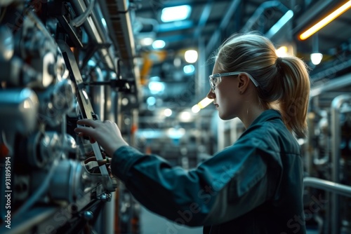 Caucasian factory worker woman hold tablet and maintenance with check part of robotic machine in workplace area. Industrial and technology support system help in working of employee concept.