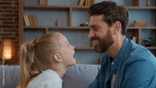 Caucasian family happy playing adorable daughter grimacing father laughing dad looking at funny little child kid girl open mouth wide yelling game play smiling enjoying play game in couch together