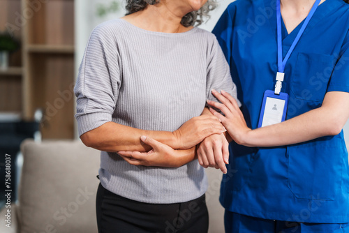 Caucasian female doctor assists in supporting an elderly Asian patient while they both sit on the sofa, ensuring comfort and stability during the interaction.