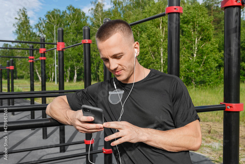Caucasian fit sporty young man choosing soundtrack music on smartphone using headphones while jogging running outdoors. Choosing his favorite workout music.