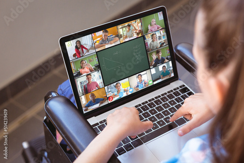 Caucasian girl attending online class over video call on laptop while sitting on wheelchair at home