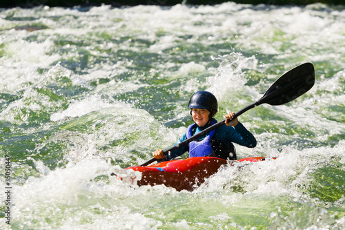 Caucasian girl kayaking in river