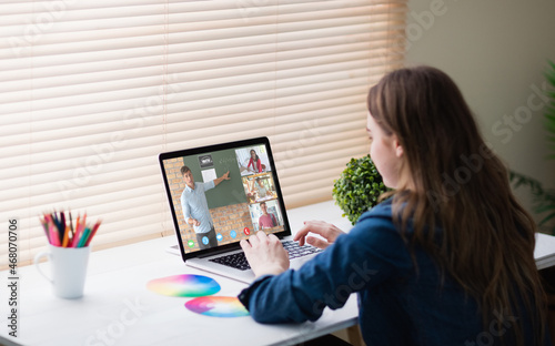 Caucasian girl using laptop for video call, with smiling diverse high school pupils on screen