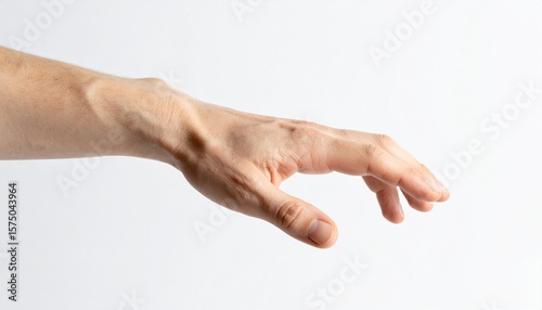 Caucasian hand reaching out with pale skin and visible veins on white background, representing gesture, care, and touch.