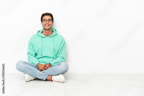 Caucasian handsome man sitting on the floor with glasses and happy
