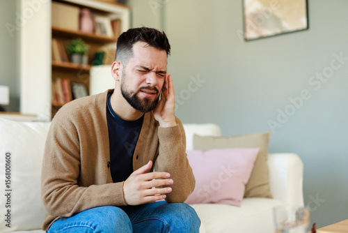 Caucasian Male Adult Showing Signs of Migraine Pain Seated on Living Room Sofa with Bookshelf Background