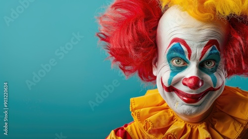 Caucasian male clown with colorful hair and face paint smiling