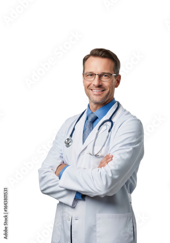 Caucasian male doctor mid-40s with short brown hair, eyeglasses, blue shirt, tie, white lab coat, stethoscope, confidently smiling on transparent studio background with copy space, concept of medical