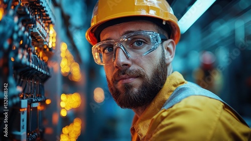 Caucasian male engineer in hard hat inspecting electrical panel with focused expression
