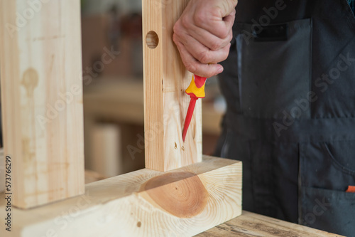 Caucasian man assembles the table with a screwdriver. Close-up of a carpenter's hands.
