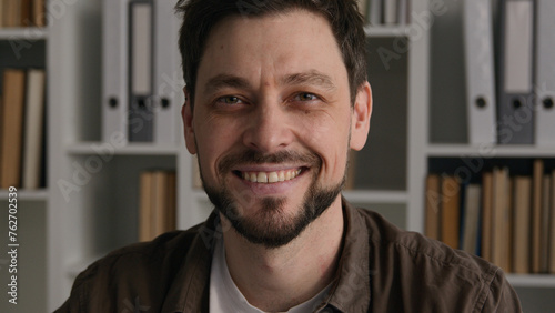Caucasian man graduate teacher tutor mentor in college university library books class happy smiling businessman office employee entrepreneur looking at camera smile joyful headshot business portrait