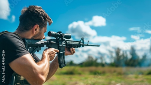 Caucasian man holding a rifle outdoors on a sunny day. Concept of firearms, shooting sport, gun safety, tactical training