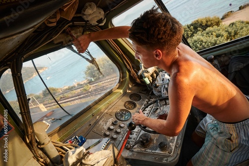 Caucasian man in the driver's cab of a large locomotive, adjusting a component over the window