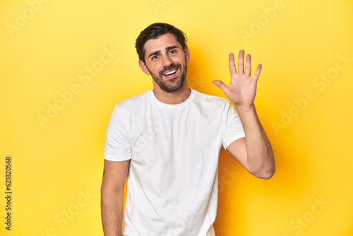 Caucasian man in white t-shirt on yellow studio background smiling cheerful showing number five with fingers.