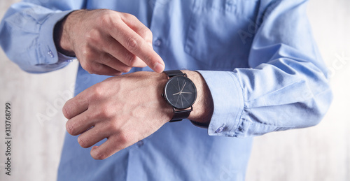Caucasian man showing wristwatch in office.