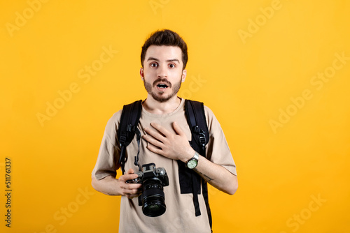 Caucasian man wearing beige tee posing isolated over yellow background feeling shocked and surprised, smiling, taking hand to heart while holding dslr camera.