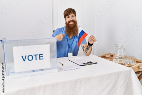 Caucasian man with long beard at political campaign election holding russia flag pointing finger to one self smiling happy and proud