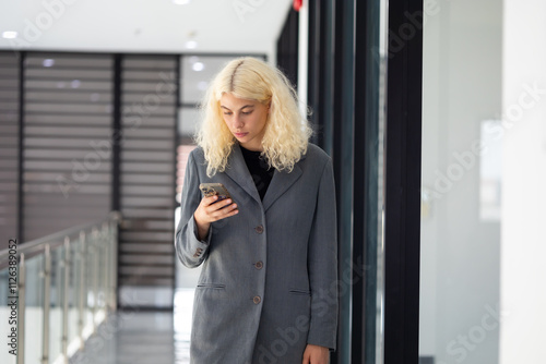 Caucasian People talking conversation with mobile phone. Portrait of smiling business woman. Confident successful business female people wear casual classic jacket woking in office
