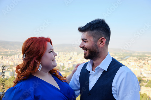 Caucasian plus size red headed woman and her turkish beloved man look to each other. Mixed race couple on a romantic date. Middle eastern man and caucasian woman marriage or engagement
