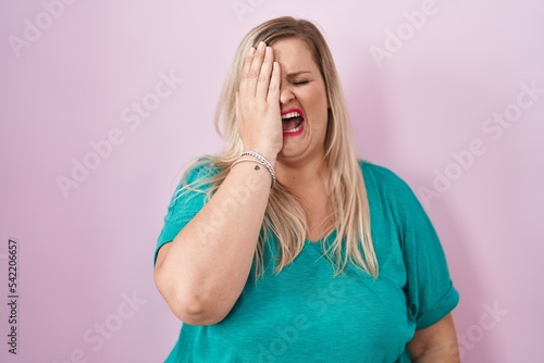 Caucasian plus size woman standing over pink background yawning tired covering half face, eye and mouth with hand. face hurts in pain.