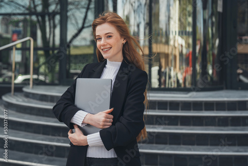 Caucasian red-haired businesswoman standing in city holding laptop and feel exiting and happy for the new job. Exited girl standing at street. Business woman
