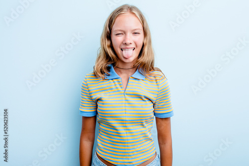 Caucasian teen girl isolated on blue background funny and friendly sticking out tongue.
