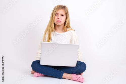 caucasian teen girl sitting with laptop in lotus position on white wall crying desperate and depressed with tears on his eyes suffering pain and depression. Sad facial expression and emotion concept.