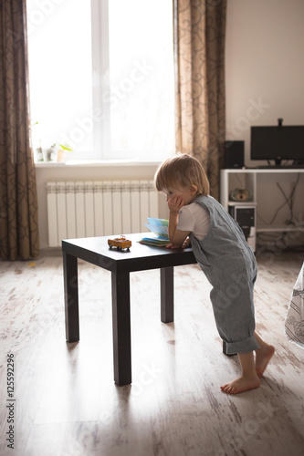 Caucasian Toddler boy playing with book, boredom, lifestyle