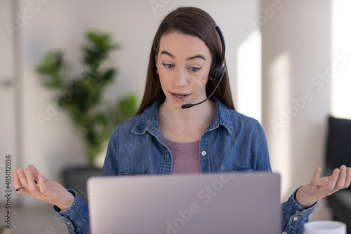 Caucasian woman at home remote working on laptop computer talking to her colleague