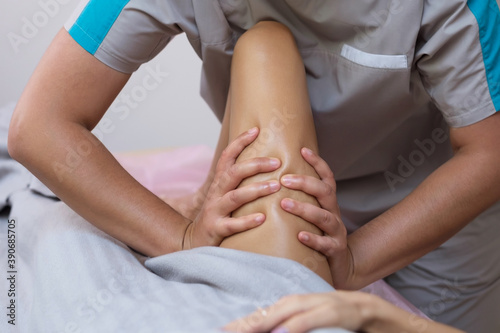 Caucasian woman getting a leg massage in the spa salon. Body care concept. Special anticellulite treatment.