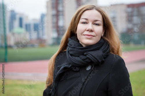 Caucasian woman portrait in black coat and scarf, long hair. Outdoor