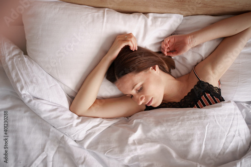Caucasian woman sleeping in bed. Lady enjoys fresh soft bedding linen and mattress in bedroom