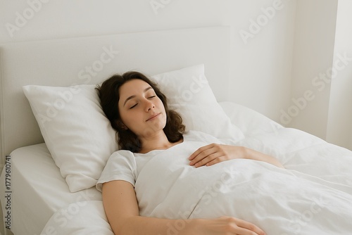 Caucasian woman sleeping peacefully in white bedding in minimalist bedroom. concept of restful sleep, tranquility, relaxation
